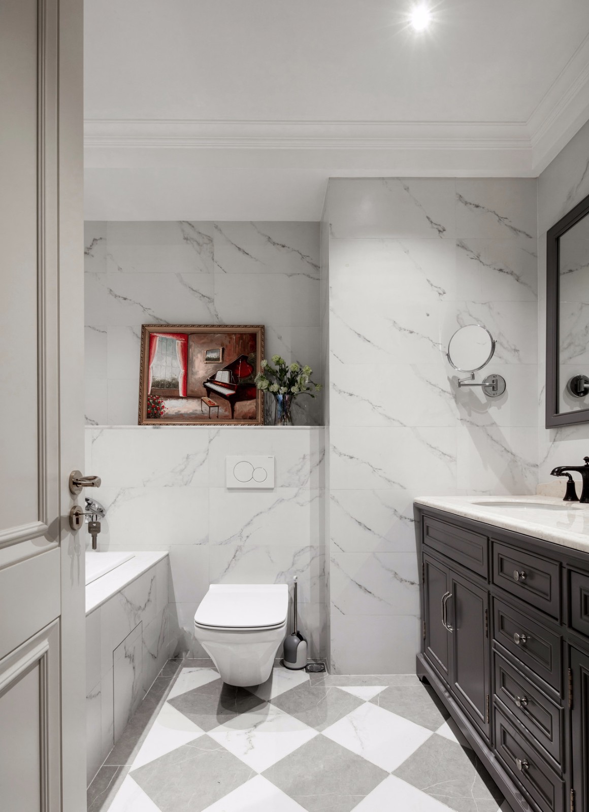 主臥的衛(wèi)生間滿足了房東的要求,浴缸+梳洗臺+儲物柜+馬桶全部都有。因?yàn)樵谥髋P,可以滿足泡澡需求而不被打擾,大概牙醫(yī)日常用來放松的場所。 墻面和浴缸表面均采用同樣花紋大理石,不規(guī)則的灰色紋路隨意點(diǎn)綴,任意而妄為;地上的大理石采用菱形灰白大理石,與墻體做呼應(yīng)。墻上的裝飾畫,我個(gè)人很喜歡,使整個(gè)使用空間格調(diào)迅速提高。