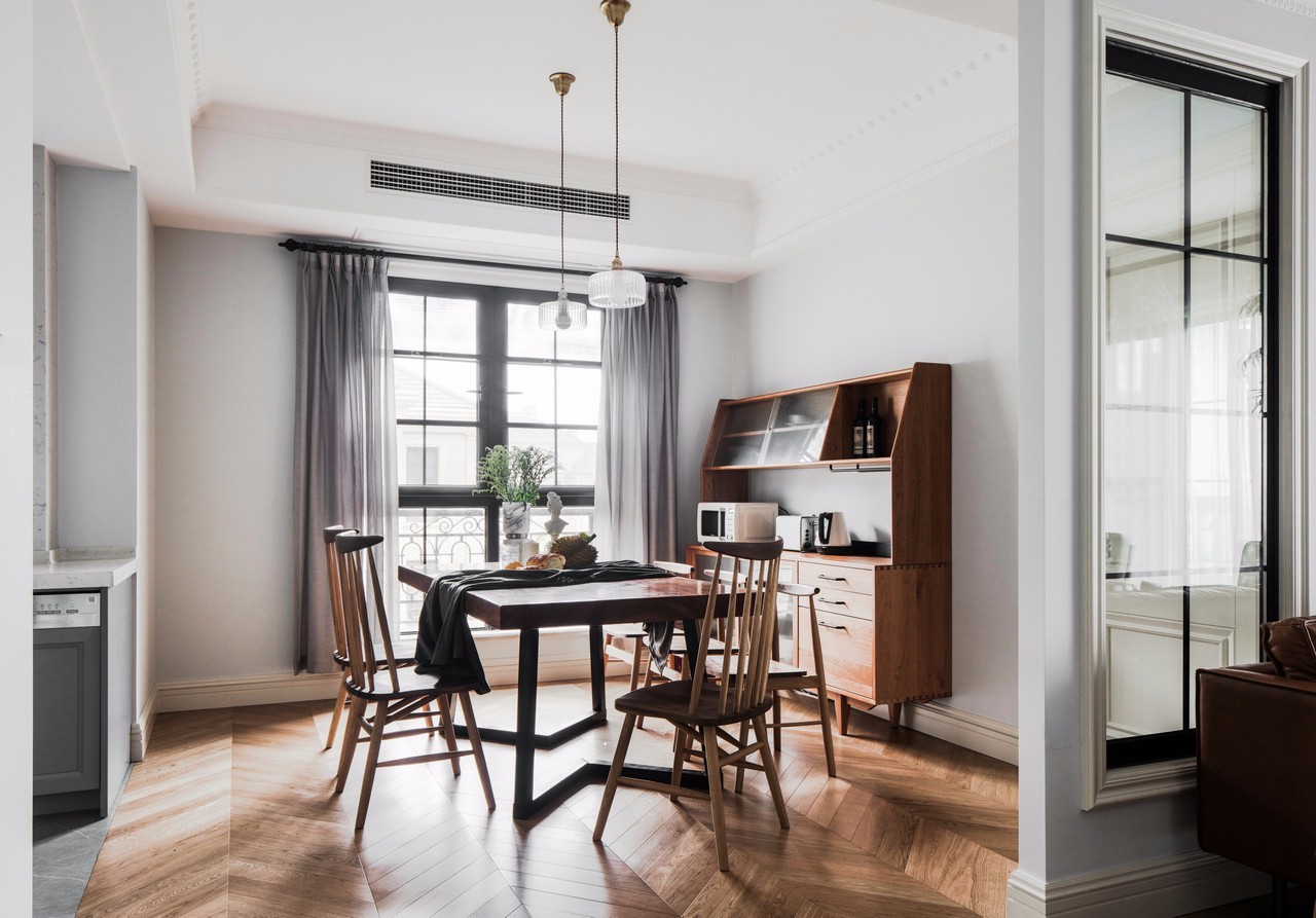 因日常只有三人食用,菜品不會很多,偶爾會有父母做客,滿足房主想要的長行餐桌(正好滿足五人食用,空間不會擁擠) 餐桌后面我又放置了一個(gè)儲物柜,色調(diào)與餐桌一致,兼顧了美感和平衡感。可以放置很多廚房放不下的東西(滿足房主喜歡東西擺放整齊的要求)
